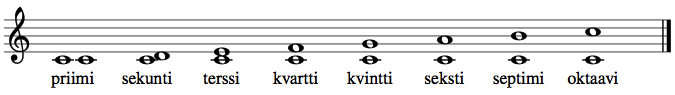 Intervallien nimet priimistä oktaaviin (1-8)